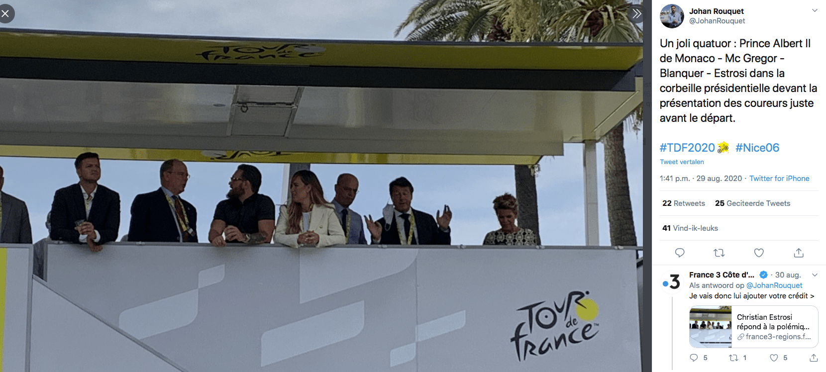 Kennelijk enige opwinding over het huwelijk van een minister in Nederland: geen mondkapjes, geen 1,5 meter afstand. Ongeveer hetzelfde verhaal in Nice (Alpes-Maritimes) bij de start van de Tour de France. Prins Albert II van Monaco (2e van links) en zijn vrouw, burgemeester Estrosi van Nice (2e van rechts, mondkapje bungelend aan het oor) en zijn vrouw; dicht op elkaar en géén ‘masque’, op een tribune. Rel op de social media.