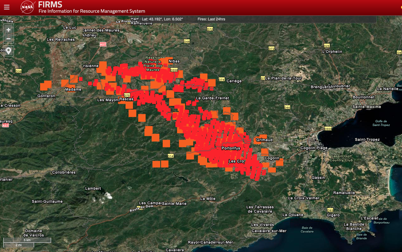 Er zijn tot nu toe al 6.000 hectares afgebrand 10.000 mensen geëvacueerd, er zijn 7 wegen afgesloten. De schade in het Massif des Maures wordt als rampzalig gezien. Minstens de helft van het Réserve naturelle de la plaine des Maures kan als verloren worden beschouwd. Er vliegen 15 blusvliegtuigen boven het getroffen gebied, op de grond 180 voertuigen. De pompiers, van wie er 6 licht gewond zijn geraakt, krijgen hulp van collega’s uit andere departementen.