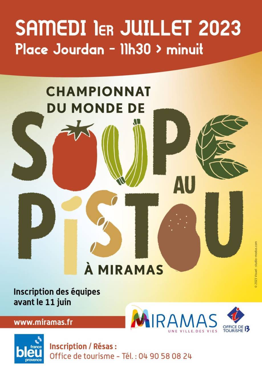 Wie maakt de lekkerste soupe au pistou, die echt Provençaalse zomerse groentesoep. In Miramas (Bouches-du-Rhône, 26.000 inwoners) organiseren ze voor de 11e keer het ongetwijfeld officieuze wereldkampioenschap waaraan overigens iedereen kan meedoen. Vanaf 11.30 uur en vanaf 18 uur proeven tijdens de repas de soir.