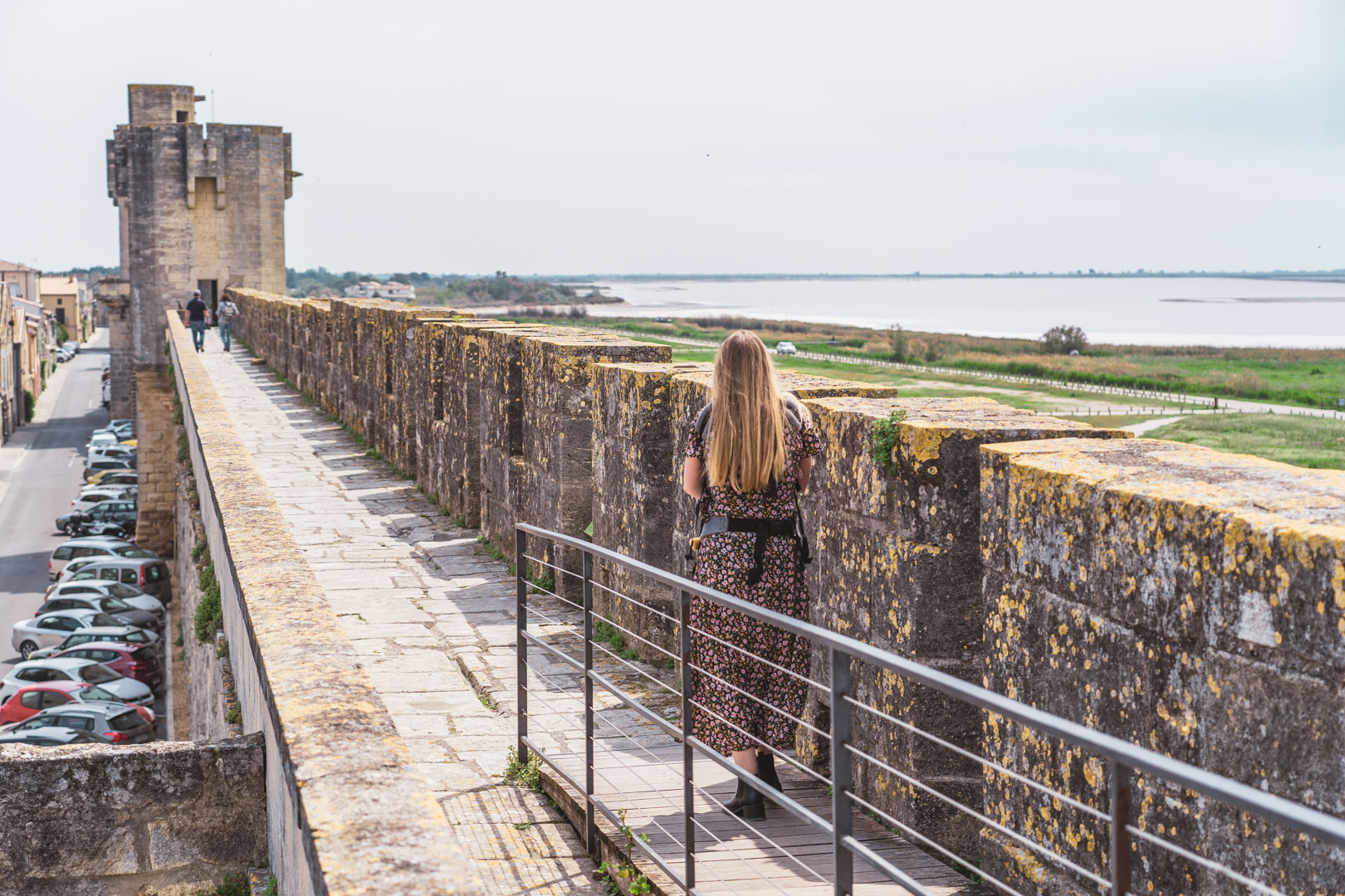 We lopen een rondje door de straten van Aigues-Mortes en gaan al snel op weg naar de stadsmuren. Ze zijn hét hoogtepunt, een bezoek is niet compleet zonder er even opgelopen te hebben. Je bereikt ze via een ingang aan de noordkant, bij de Tour de Constance. Ongeveer een derde van de muren is toegankelijk met rolstoel en kinderwagen. Wij hebben echter de draagzak voor onze baby bij ons, dus we gaan voor het hele rondje. In alle rust kunnen we genieten van deze rondwandeling, want druk is het niet. Om de zoveel meter kom je bij een toren uit, in sommige daarvan is een expositie ingericht, onder meer over de geschiedenis van de vestingwerken. Aan de zuidkant kun je mooi over de zoutvlaktes kijken en in de verte zien we grote witte zoutduinen liggen. Fleur de Sel, het grove zout dat hier vandaan komt, is naast dat uit Guérande net onder Bretagne, bekend in binnen- en buitenland. Grote kans dat ook in jouw plaatselijke supermarkt de herkenbare rode kartonnen potjes met zout liggen.