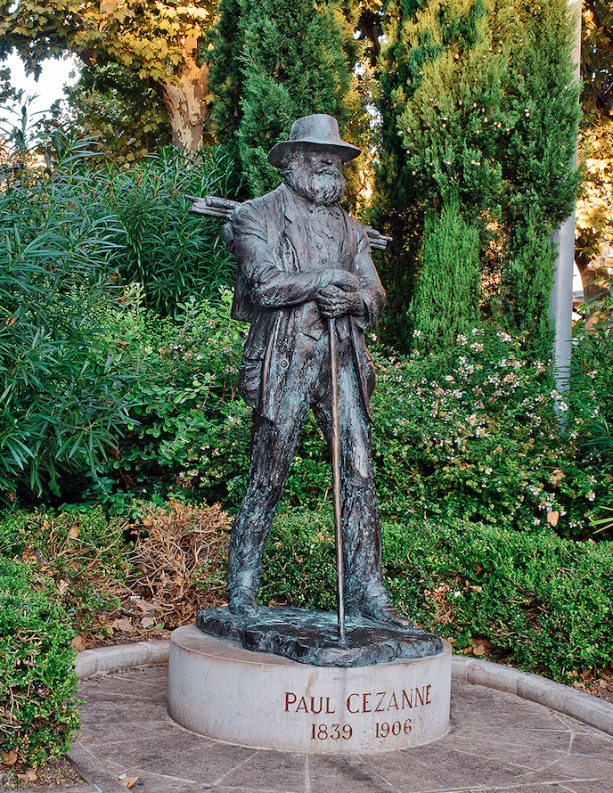 Met die erkenning zit het nu wel goed. Aix is Cézanne, in elk geval in de waarneming van het Office du Tourisme. Er is een stadsroute uitgezet, de huizen waar hij woonde, ateliers waar hij werkte, cafés waar hij naar toe ging en de plekken rond de stad waar hij zijn ezel opstelde. Een duidelijk spoor van bronzen plaquettes de ‘clous de Cézanne’ vormen een wandelroute langs de vele locaties waar Cézanne heeft geleefd en gewerkt, beginnend met zijn geboortehuis en eindigend bij de ‘cimitière Saint Pierre’, waar hij begraven ligt. En hij heeft er nu een eigen standbeeld.