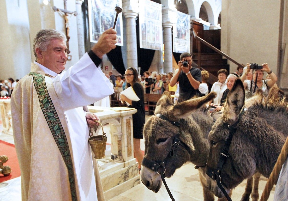 Wil je tijdens de dienst je medaillon, mobieltje, favoriete viltstift, broodsnijplank, salarisstrookje, steunkousen, glasservies of noem maar op, laten zegenen, dan kan dat. Motoren, ook geen probleem, al moeten die wel voor de deur van de kerk op de wijwaterkwast wachten. Maar de grootste hit van père Florini zijn de dierenmissen, ergens begin oktober. Honden, katten, konijnen, parkieten: ze mogen gewoon de dienst bijwonen en daarna met Florini’s zegen naar huis. Paarden, ezels en andere grote huisdieren zijn eveneens welkom, al moet de eerste koe nog gesignaleerd worden. Bekijk hier een filmpje. En wie een stevige wandeling niet schuwt kan de priester vergezellen tijdens een processie naar – en een (openlucht)mis bij – het idyllisch gelegen kapelletje van La Madone d’Utelle in de bergen boven Nice, waaraan père Florini ook verbonden is. En niet zo’n beetje ook.