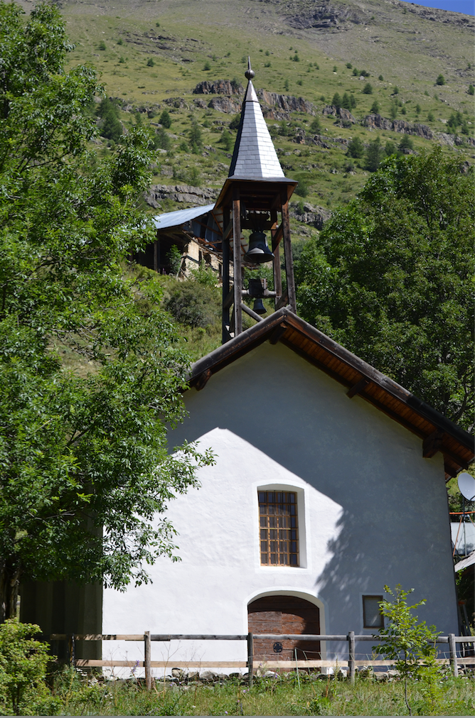Links, voorbij een doorzonbos met mélèzes (lariksbomen), spettert een beek. Rechts aan de overkant van het ravijn stort een waterval zich witschuimend in een kom in de diepte. De auto’s op de parking worden steeds kleiner. Boven, voorbij een paar verweerde dennen, komen de eerste huizen in zicht. Even verder nog en daar heb je het kerkje. Met daarnaast en daarboven weer een paar huizen. Stenen onderbouw, de rest van hout. Sommige zijn vervallen. Wie woont daar nou?