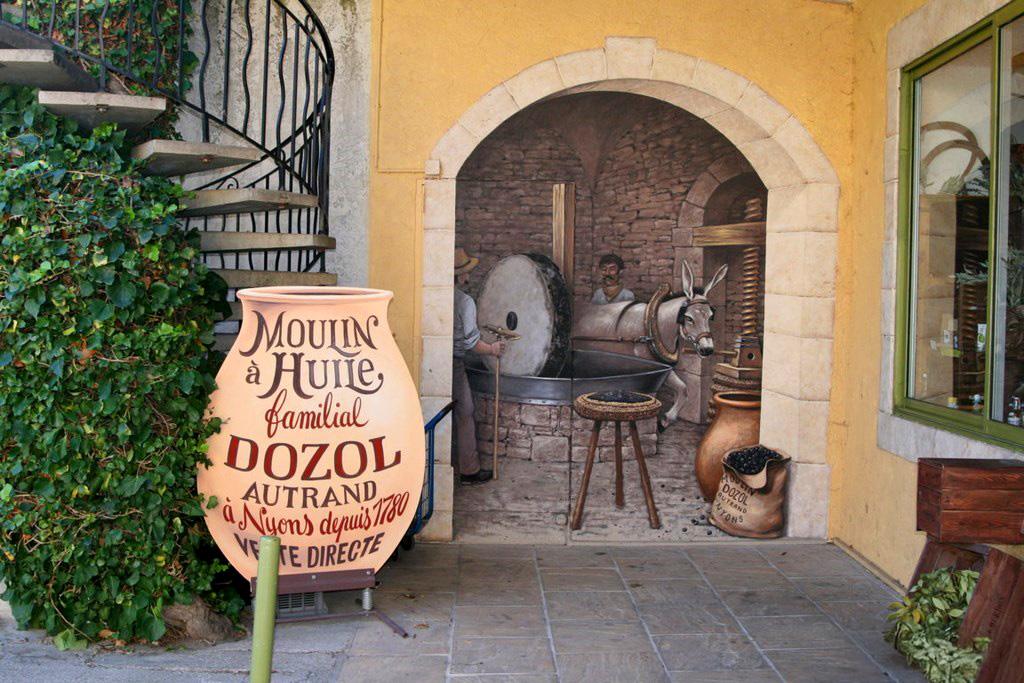 De oude olijfmolen is nu een museum annex winkel waar alles de aanbidding van de kleine, schrompelige olijf uitademt. Losse olijven, tapenades, ingeblikte olijven, olijfzeep, olijfhouten gadgets en natuurlijk de olie. In eerste persing, maar ook naast de extra vierge, de gewone vierge en de geraffineerde variant. Schrik niet van de prijzen: de olie is het waard. Niet voor niets kreeg de olijfolie van de tanche in 1994 als eerste een Appellation d’Origine Protégé-status en keurmerk. Goedkoper dan in het museum koop je de olie op de markt en de winkeltjes in de stad. Daar wordt ie uit grote vaten getapt. Er is absoluut geen reden om te geloven dat ze gewone olie als extra vierge verkopen.