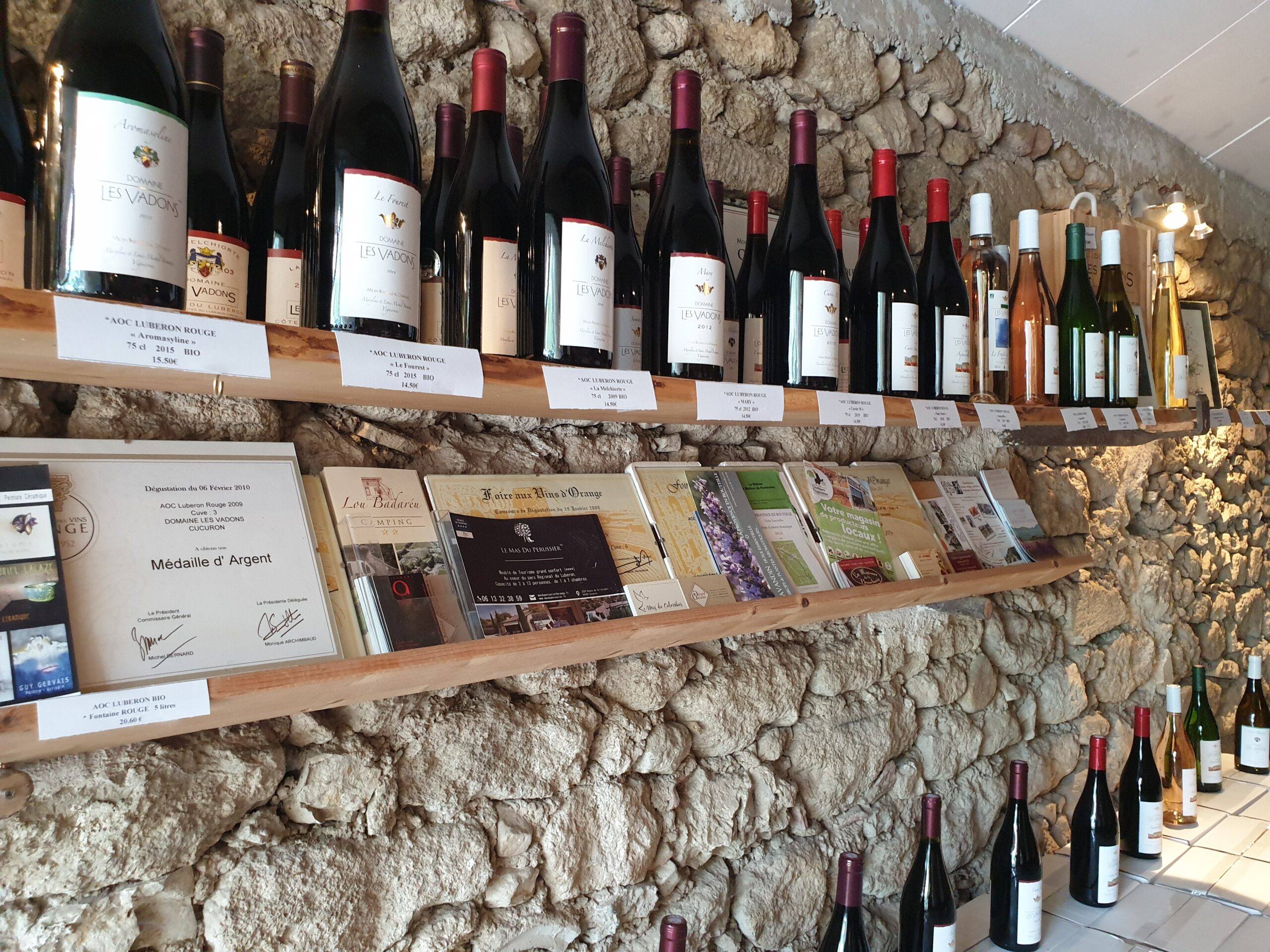 Louis-Michel neemt ons al pratend mee naar zijn ‘cave’. Er volgt geen gelikte power pointpresentatie in een chique ontvangstruimte. Au contraire, op een betonnen cuve heeft hij het vinificatieproces in beeld gebracht. Ook voor de niet-wijndeskundigen in het gezelschap een begrijpelijk verhaal. Hij legt uit dat de fauna en flora in de wijngaarden bijdragen aan zijn benadering van biologische landbouw. De wijngaarden (8ha) van Domaine les Vadons strekken zich uit op de uitlopers van de zuidkant van de Grand Luberon. Het terroir bestaat uit terrassen en zachte hellingen met kleirijke kalkbodems en rolkeien.