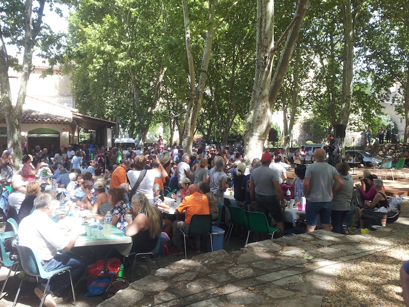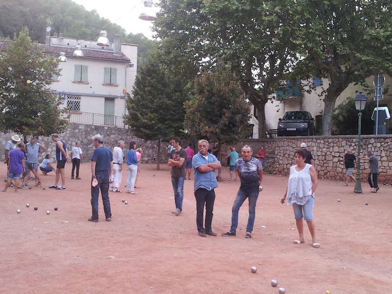 ‘O God, hommeles’, constateerde ik toen we het dorp binnenreden en meteen in een file belandden. Er was feest op het dorp. Met achtereenvolgens en tegelijkertijd een pétanque-concours, een expositie van ‘voitures de collection’, een collectieve lunch van de dorpsvereniging en een ‘hommage à Johnny Hallyday’ waarbij een imitator van de verscheiden zanger zou optreden. En dat allemaal op de grote parkeerplaats en het naastgelegen weiland waar je normaal gesproken zelfs bij een toeristische invasie je auto nog wel kwijt kon, maar waar nu dikke dranghekken voor stonden. Ik kachelde door tot voor de tabac en parkeerde strategisch tussen de standaards met ansichtkaarten (jawel, die hebben we hier nog, ze worden zelfs nog gekocht) zodat de echtgenoot naar binnen kon wippen voor de krant en ik een snelle oversteek naar de épicerie kon wagen. Met de nadruk op wágen: de file reed dan wel langzaam, maar zéér vastberaden door en iedereen die een parkeerplekje meende te ontwaren dook er vol gas in.