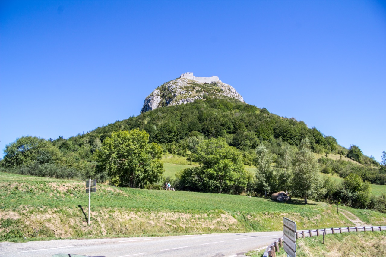 Die omgeving – we praten over het Pays de Sault – is met zijn 1200-1400 meter geen hooggebergte. Hoeft ook niet, voor de wandelaars onder ons biedt het voldoende variatie en uitdaging. De Gorges de la Frau bijvoorbeeld, waar bijna geen plat stukje pad te vinden is. Schitterend, maar voor verstokte autorijders zoals ik erg vermoeiend. Er staat niet voor niets op het bord: ‘passage dangereux, risque d’éboulement par fortes intemperies’ … Nee, dan kun je maar beter naar de Gorges de Galamus gaan, en voiture. Hier rijden is echt een belevenis. De twee kilometer lange weg kronkelt tussen Cubières-sur-Cinoble en Saint-Paul-de-Fenouillet en voert onder andere langs de hermitage en de grotkapel van Saint-Antoine de Galamus, rechtstreeks uit de rotsen gehouwen in de 7e eeuw. Er is een terras en je kunt er koekjes kopen. Die schijnen beroemd te zijn. Ik vond ze niet bijzonder … De auto kun je kwijt op de parkeerplaats bij het uitzichtspunt (Belvédère). Onderaan klettert het water van de Agly, waar wildwaterkanoërs hun kunstjes vertonen. Voor de fotografen onder ons een niet te missen plek!