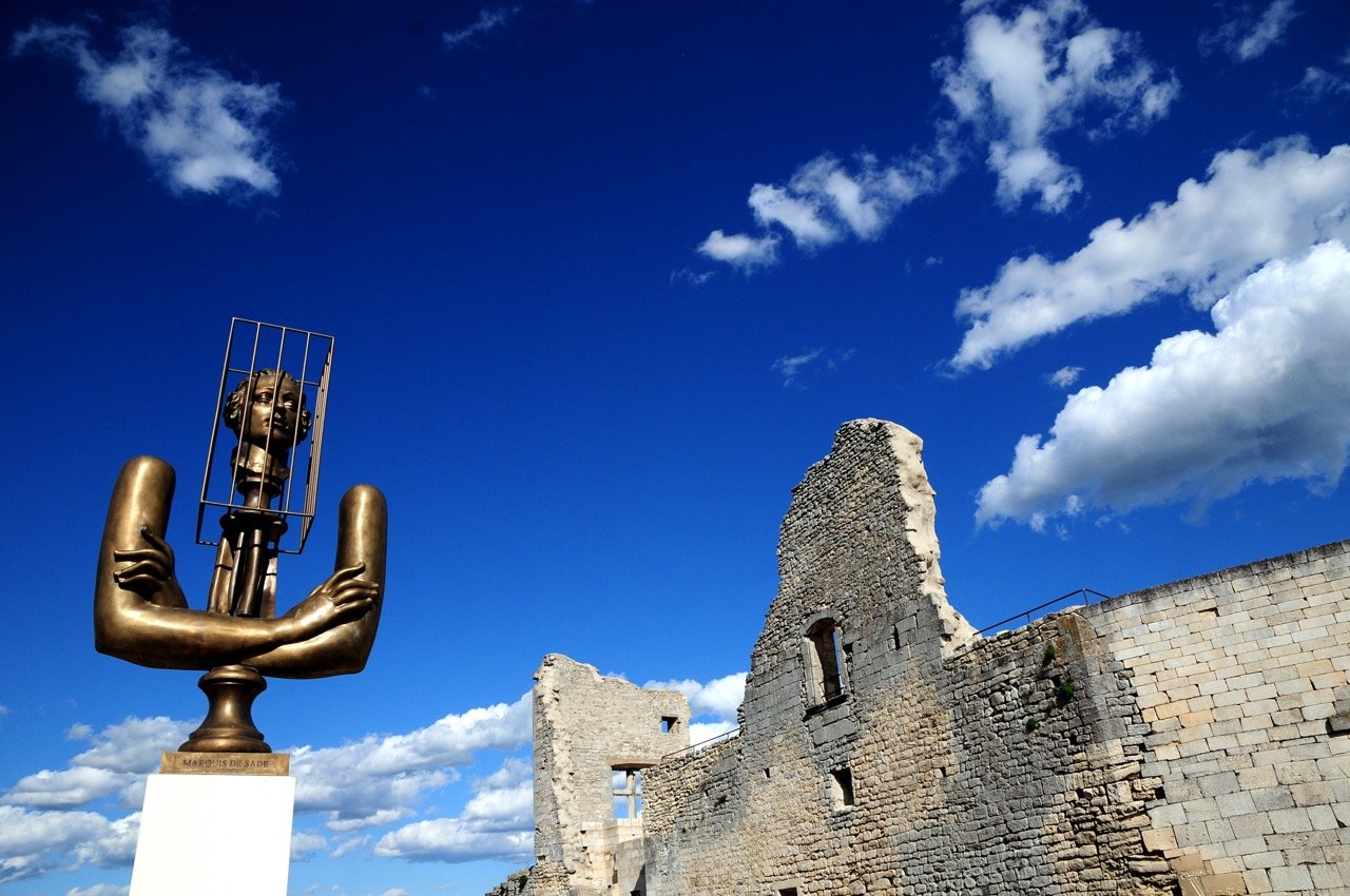 In de nauwe straatjes wemelt het van de winkeltjes die bij nadere beschouwing toch net even een andere insteek bieden dan je zo op het eerste gezicht dacht. De épicerie verkoopt luxe Maxim’s merkproducten. De bakker doet in zonnebrillen van de baas (Cardin), de lokale middenstand heeft massaal (nou ja, met z’n zevenen) gekozen voor het uitbaten van een serie ‘galeries d’art’ en het verstofte stationnetje is opgewaardeerd tot ‘cinéma 3D’. Naast de fraai geconserveerde ruïne van het De Sade-kasteel staat een imposant kunstwerk en een stukje verderop nog eentje rken neergezet); het ene laat twee ruimhartig uitgespreide armen zien, het andere een gekooid hoofd. Beide slaan blijkbaar op de roemruchte markies, die in dit door hem indertijd totaal herverbouwde voorvaderlijke kasteel met enige regelmaat zijn toevlucht zocht als hij weer eens door justitie (of zijn woedende schoonmoeder) gezocht werd wegens zijn scabreuze levensstijl.