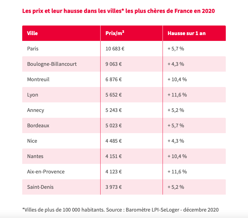 De woningsite seloger.com zette de prijzen (per m2) van de 10 duurste steden met meer dan 100.000 inwoners op een rij. En zette er meteen bij met hoeveel procent die prijzen in een jaar tijd zijn gestegen. Kijk even naar de afbeelding en je weet genoeg. Die prijsstijgingen zijn niet voorspeld. Er werd juist verwacht dat vanwege corona de belangstelling voor de stad zou teruglopen. Dat virus? Dan liever maar iets buiten druk bevolkt.