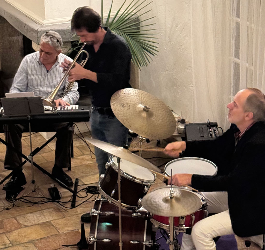 Mooi jazz-concert beleefd in de grote living van vriendin Karine, die met man en twee zonen enkele jaren geleden naar de Côte d’Azur is komen wonen. Het lijkt een trend: verrassende huiskamerconcerten waarover je hoort via whatsappgroepjes. Iedereen brengt wat mee om te eten, er is een bijdrage voor de muzikanten en je leert fijne, kunstminnende mensen kennen. De muzikanten zijn meestal het doorgeefluik van weer andere whatsappgroepjes, dus ga je naar een concert, maak een praatje met de pianist, of de trompettist en vraag of je op hun mailinglijst mag staan. Zo gaat dat ene ‘Jazz bij Karine’-groepje over naar ‘Les vendredis chez Fred’ of ‘Micheline Fun’, dat is mijn groepje, daar kan je deel van uitmaken via het scannen van bijgevoegde QR-code.