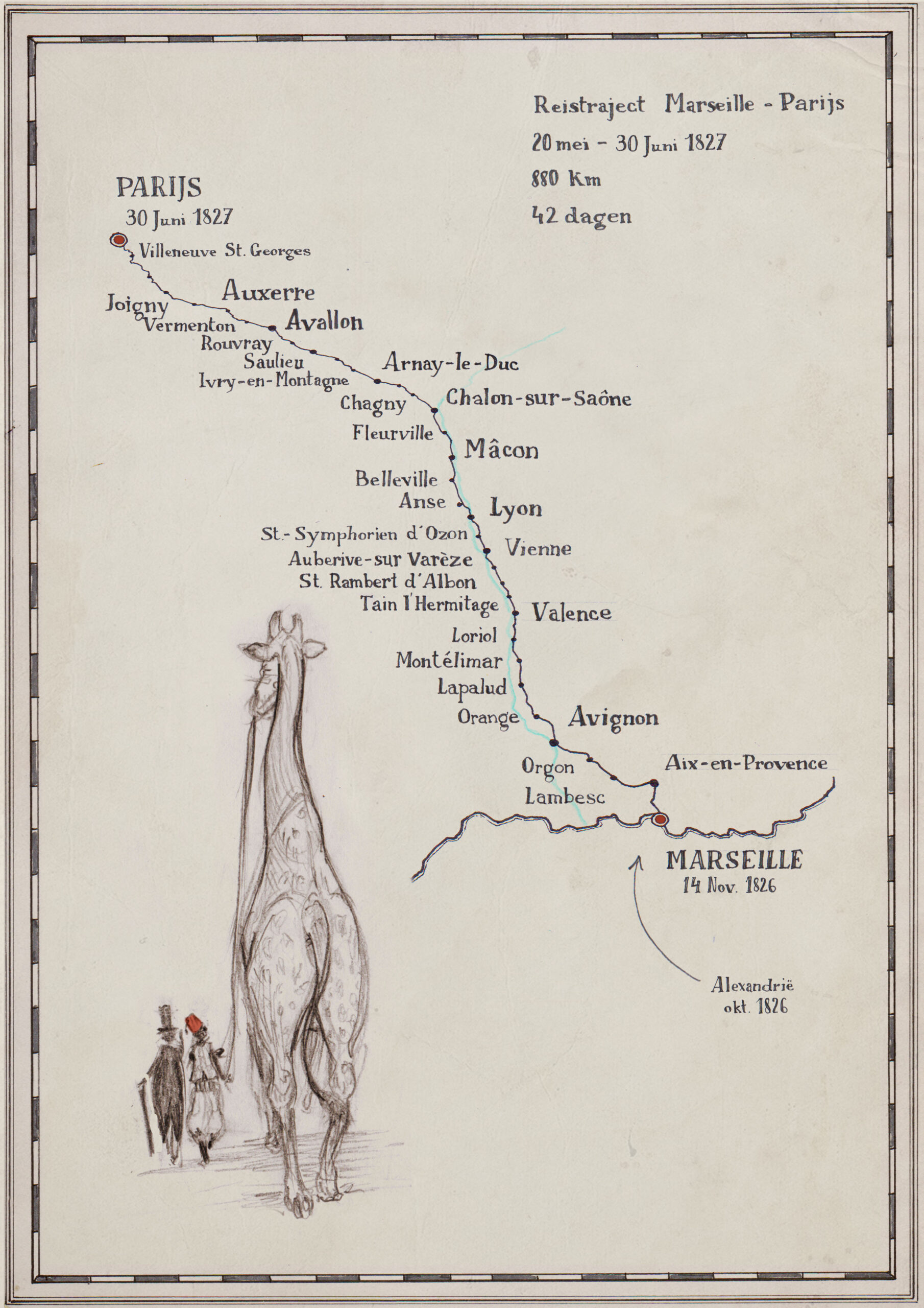Een bont gezelschap van dieren en begeleiders reist over wegen, door dorpen en steden, geflankeerd door een niet te stuiten mensenmassa die van heinde en verre het ‘vriendelijke monster’ komt bewonderen. Ze doorkruisen Aix-en-Provence, Avignon, Orange, Vienne en Lyon. Volgens de plaatselijke krant stromen in deze plaats zo’n dertigduizend mensen toe. Mâcon, Chalon, Avalon… Overal is het enthousiasme over de giraffe groot en er ontstaat een ware giraffengekte. Klokken en kandelaars, inktpotten en tabaksdozen verschijnen in de handel met een afbeelding van het opmerkelijke dier. Er komt een giraffenmode, met geborduurde stoffen, dassen, hoeden en kapsels. Schrijvers uiten zich in hoogdravende gedichten, liederen en burleske kluchten.