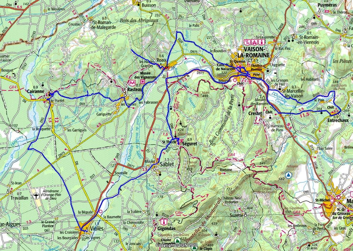 De beklimming van die col, qua lengte ongeveer 2 km, viel niet echt mee, zelfs niet op de gehuurde VAE, maar de inspanning was meer dan de moeite waard. Dwars door wijngaarden zover het oog reikte, het leek wel of het naar de godendrank rook. En formidabele vergezichten. Daarna de afdaling naar Saint-Roman-de-Malegarde, op weg naar Buisson. Ooit ook zo’n ‘commanderie’ van de Tempeliers, met een in 1982 gerestaureerde kapel in Romaanse stijl.
