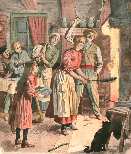 Rond die ‘crespèu’ bestaan tal van mythes; zo zou een goede graanoogst gegarandeerd zijn, als je met de pan in je rechterhand de eerste pannenkoek in de lucht liet flippen, terwijl je een gouden muntstuk in je linker hield. In de Provence bestond ook nog het gebruik die munt daarna in de pannenkoek te wikkelen en ‘m bovenop de kast in de woonkamer te leggen. Met een beetje mazzel vond je daar de ingedroogde restanten van het vorige jaar met ook zo’n munt erin. Met nog meer mazzel trouwens alléén de munt; over de pannenkoek hadden de ratten en muizen zich inmiddels ontfermd, dus die had daar niet weg liggen rotten. Deugde je, dan gaf je de munt aan de eerste de beste bedelaar die langs kwam. Geluk en gezondheid waren dan voor het komende jaar verzekerd! Zat je een beetje krap bij kas, dan nam je de gok en hield dat goudstuk lekker zelf. Maar ja, die bedelaars waren natuurlijk ook niet gek en behalve die geurende pannenkoeken roken ze ook hun kans: “Siéu carga d’argen coumo un grapaou de plumo”, riepen ze dan onder het keukenraam: ik heb net zoveel geld als een pad veren heeft. Zeg dan maar eens ‘nee’.