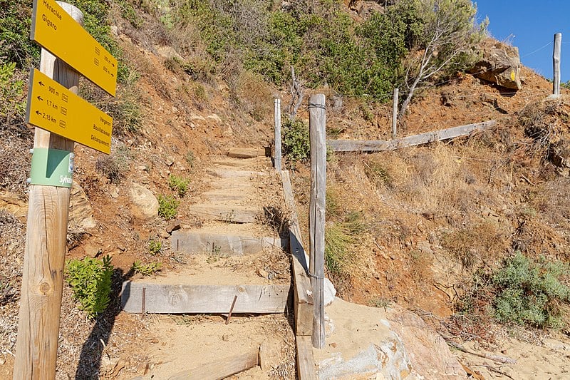 Ditmaal kiezen we voor de sentier littoral langs de kust van La Croix-Valmer. De gratis parking in de buurt van het vertrekpunt is deze periode van het jaar mooi meegenomen. We vertrekken bij de plage du débarquement, een uitgestrekt zandstrand dat in de zomer waarschijnlijk overbevolkt is maar er op deze prille lentedag verlaten bij ligt. In augustus 1944 was het er heel druk. De Amerikaanse generaal O’Daniel en zijn Franse medestander de Lattre de Tasigny landden met hun troepen op dit strand, het begin van de bevrijding van de Provence.