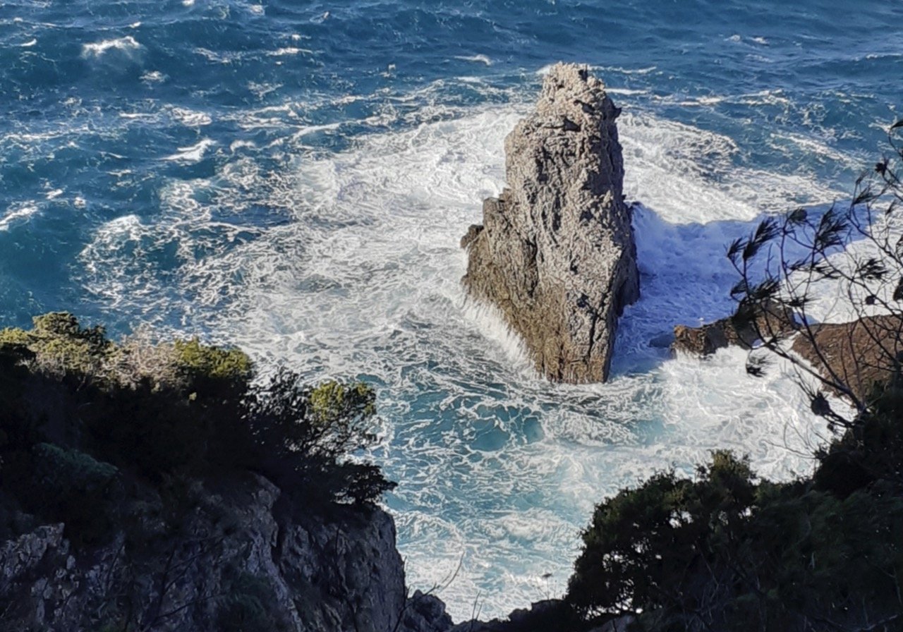 De tocht gaat voortdurend op en af, van klif naar klif. Vandaag krijgen we een extra moeilijkheidsgraad voorgeschoteld. De wind waait snoeihard. IJzig koud. Hij maant je aan om nog voorzichtiger te zijn wanneer je nieuwsgierig naar de kolkende golven in de dieperik wil speuren. Gelukkig kan je af en toe schuilen in de bossen die de steile flanken begroeien. De zee baart schuimende golven die uitsterven op de grillige rotsen. De niet in te tomen zonnestralen verspreiden een verblindende schittering op het wateroppervlak, een glinstering die bijwijlen een griezelige atmosfeer uitstraalt. De spectaculaire landschappen wisselen elkaar zonder onderbreking af. Het woelige wateroppervlak biedt allesbehalve een monotoon spektakel. Lichtinval, kleine eilandjes, eindeloze vergezichten, ze zorgen na iedere bocht voor een adembenemende afwisseling.