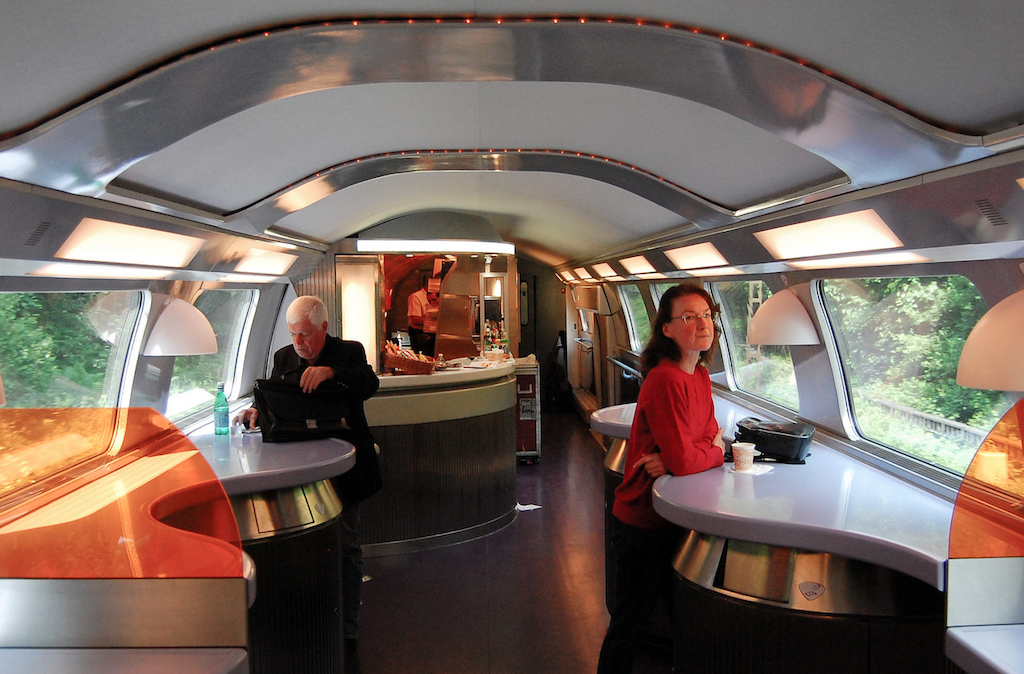 Gek genoeg lijk je in de comfortabele stoel vrijwel niets te voelen van treinreizen en die enorme snelheid, maar de bar bereiken voelt als lichtelijk aangeschoten lopen na een déjeuner bien arrosé. Zwabberend langs een bont reisgezelschap, van wereldreizigers tot zakenlui, langs groepen studenten werkend aan een gezamenlijke opdracht tot families met een ontelbaar aantal schattige kindertjes, bereik ik de lunchoase. Het is er merkwaardig stil, gek genoeg ben ik nagenoeg de enige in de lange trein die de wiebelende tocht heeft ondernomen. De voedselconducteur wenst me uitermate vriendelijk welkom in de bar die bestaat uit drie tafeltjes en een bestelcorner. Er zijn twee jongens die een biertje drinken aan de tildevormige tafeltjes. Aan het andere tafeltje drinkt de conducteur van dienst een espresso en bedenkt alvast vermanende woorden aan lawaai makende kinderen en mondmaskerverslappers wanneer hij na zijn pauze zijn surveillanceronde zal vervolgen.