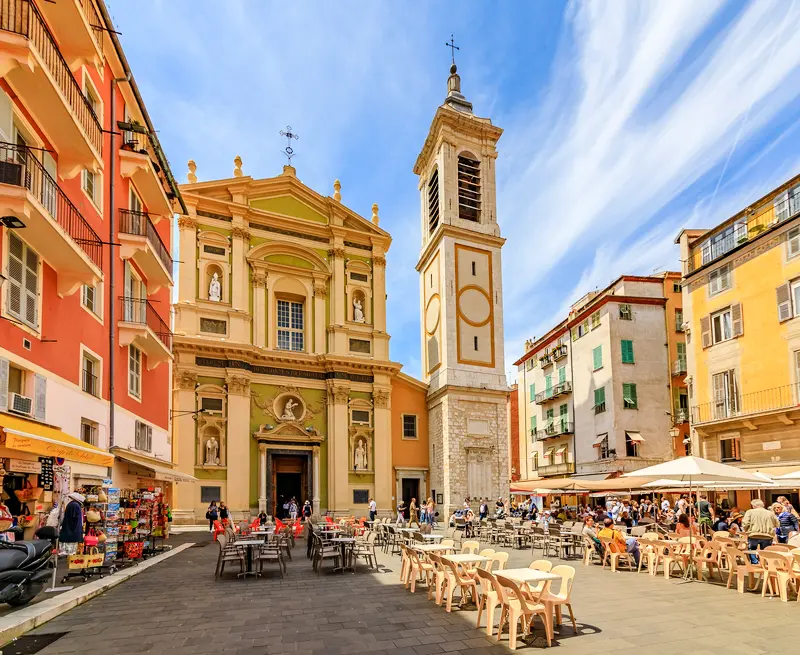 Als je in Nice bent, ga je natuurlijk ook naar de beroemde markt op de Cours Saleya, niet ver lopen van Vieux Nice. Alleen door een muur en de weg gescheiden van de zee en onlangs een beetje opgeknapt, meer ruimte voor en tussen de kramen. Groenten, bloemen, kaas, noem maar op, en op maandagochtend antiek en brocante. Onmiskenbaar een méditerrane ambiance, ofschoon afdingen niet op prijs wordt gesteld. Talloze terrasjes en restaurantjes, over het algemeen aan de prijs. Je kunt beter even doorlopen naar de Place Rossetti, het hart van Vieux Nice. Dankzij de 17e eeuwse kathedraal Sainte-Réparate die gewijd is aan de heilige martelaar van de stad. De kerk, gebouwd tussen 1650 en 1699 wordt bekroond door een koepel met veelkleurige dakpannen en is versierd met een gevel die in 1980 opnieuw geschilderd werd. Binnen vind je er weelderige barokke kapellen, de sacristie is van houtwerk uit de 18e eeuw en er zijn relikwieën van de heilige Alexander die vaak aanbeden werd (en wordt) in tijden van droogte.