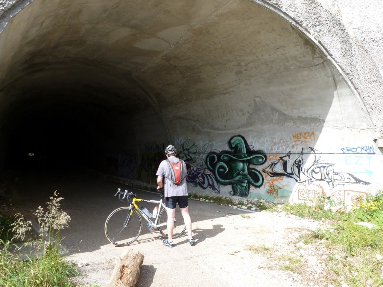 Voor de ingang waren barrières neergezet, maar het was duidelijk dat de tunnel bestemd was voor autoverkeer, ooit tenminste. In de verte zag ik de silhouetten van een groepje mensen, zwart zich aftekenend tegen een halve bol licht. Wandelaars. Je kon blijkbaar wel door de tunnel lopen. Vanachter me reden zelfs twee fietsers voorbij, de tunnel in. Een lange tunnel, hoe verder je je erin waagde hoe donkerder het werd, en de fietsers voor me werden maar heel langzaam kleiner, tegen de bol met licht van de uitgang. Ik ben nogal claustrofobisch van aard, na zo’n honderd passen maakte ik rechtsomkeert.