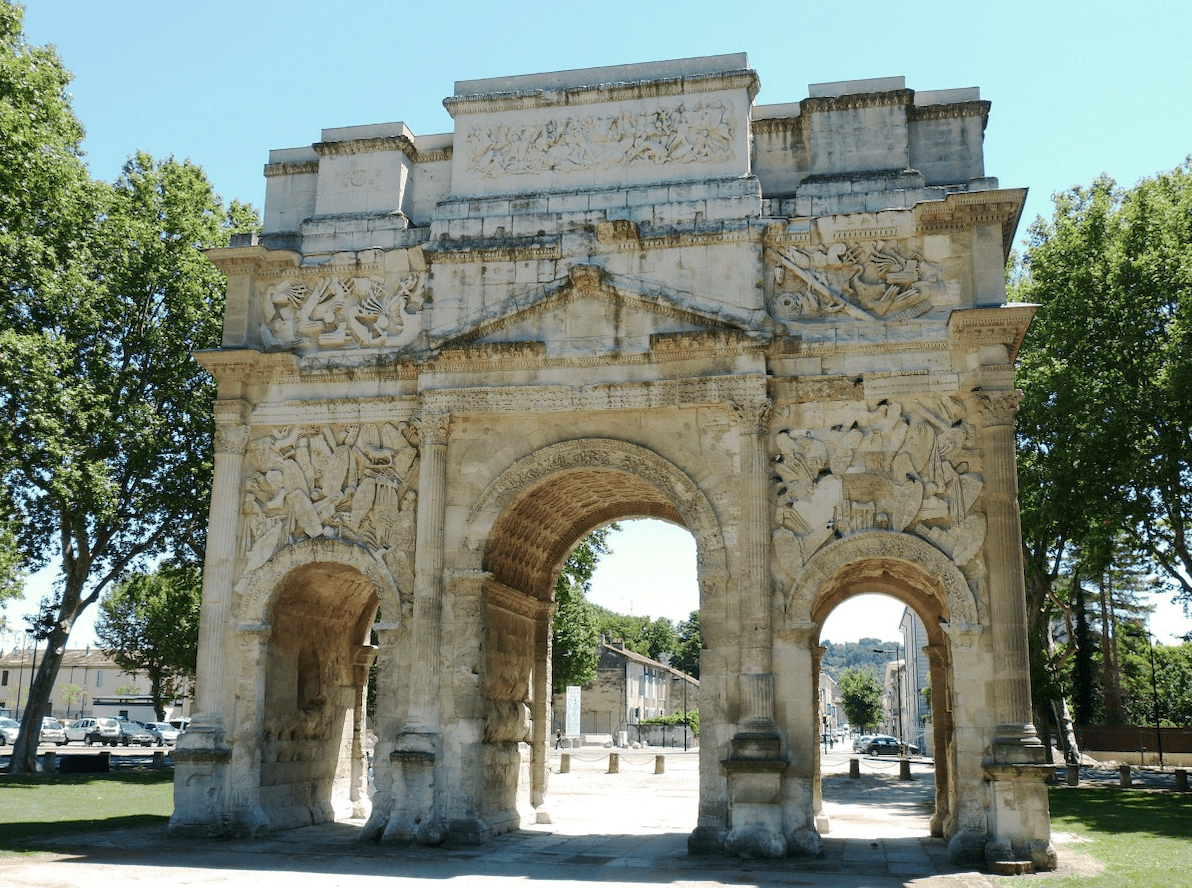 ’s Avonds in het Théâtre Antique besefte ik dat de geschiedenis van Orange veel verder teruggaat. Middenop die Muur hing een beeltenis van Octavianus Augustus. Naar verteld wordt is Orange omstreeks 35 tot 30 voor Christus gesticht door veteranen van het Tweede Romeinse Legioen. Vechtersbazen. Er staat in Orange ook nog altijd een Romeinse Triomfboog, die evenals dat hoogbejaarde theater op de werelderfgoedlijst van de Unesco prijkt. Ik ben er langs gewandeld, ik vond er niet veel aan. Mag je dat zeggen: oude stenen?