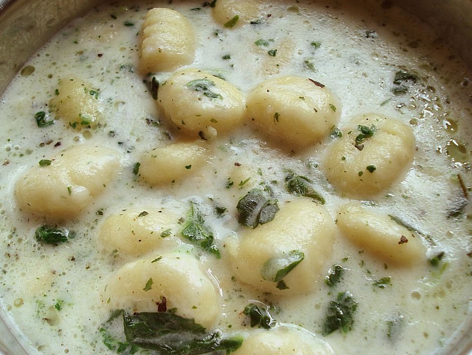 Verdeel de gnocchi over de borden, verdeel de spinazie eroverheen en giet tot slot de gorgonzolasaus erover.
