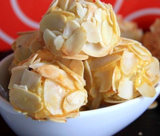 Meng in een kom de geitenkaas, de knoflook en de kruiden door elkaar. Voeg naar smaak peper en zout toe. Laat het mengsel minstens een uur opstijven in de koelkast, draai er vervolgens balletjes van ter grootte van een stuiter. Zet weer terug in de koelkast. Rooster intussen het amandelschaafsel in een droge koekenpan (dus zonder bakvet of -olie) tot het goudbruin ziet, af en toe omschudden. Laat afkoelen. Rol de kaasballetjes erdoor, zodat ze aan alle kanten van een knapperig amandellaagje zijn voorzien. Schik ze op vier borden en giet er een klein plasje vin cuit of port omheen. Serveer er rogge- of stevig boerenbrood bij.