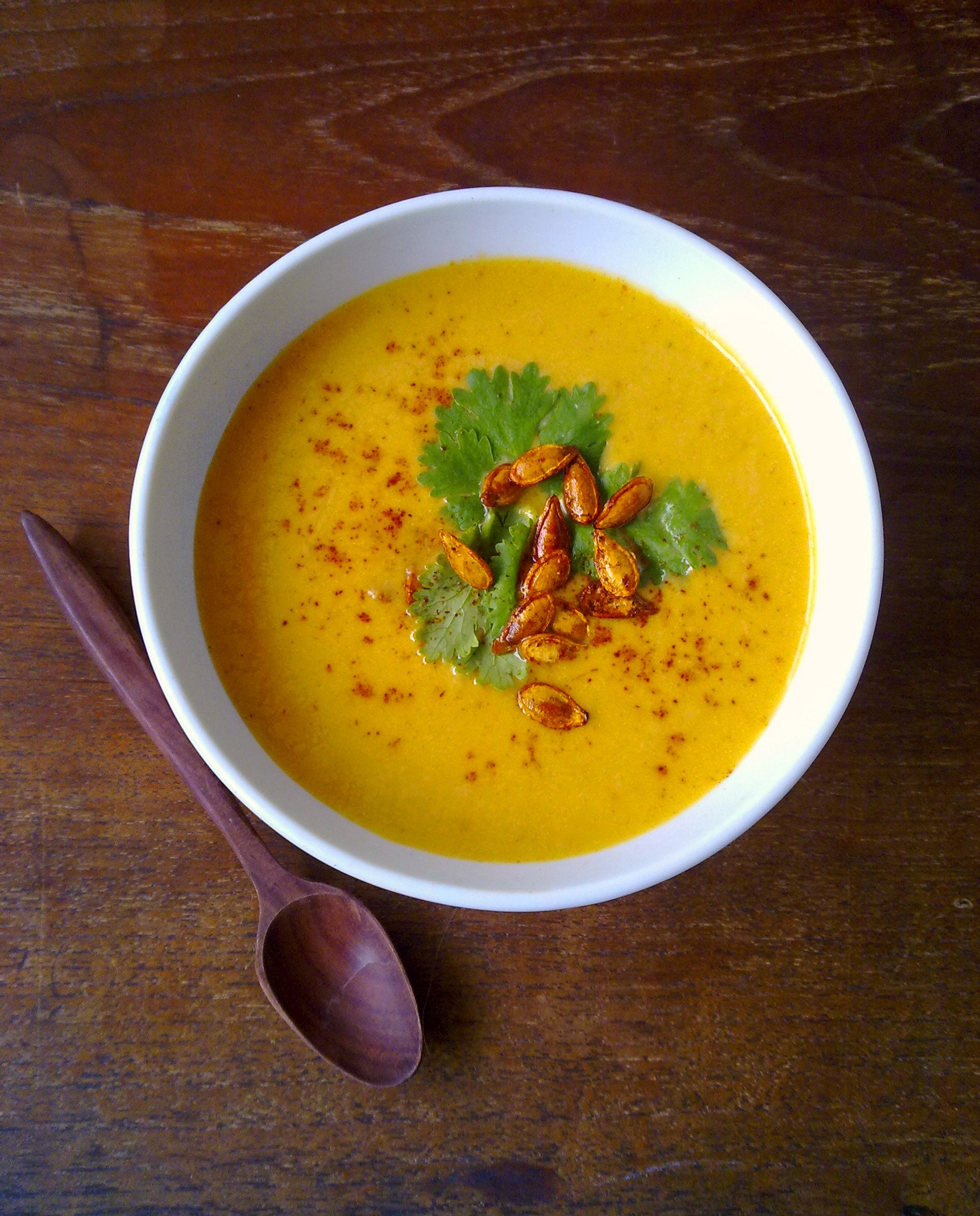 Fruit de ui in de olie in een ruime braadpan, laat glazig worden. Doe er het pompoenvlees bij, plus 2 dl water, een snufje kervel, de knoflook (uit de knijper), zout en peper naar smaak, en breng aan de kook. Doe het deksel erop en laat zo’n twintig minuten op laag vuur pruttelen.