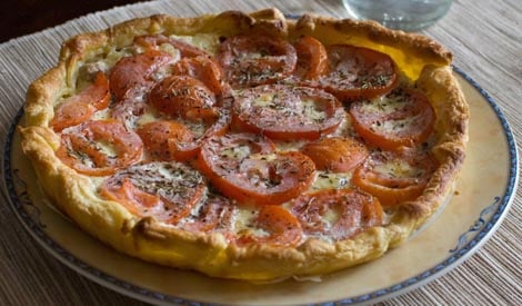 Voor de vulling: bestrijk de taartbodem dun met mosterd. Giet het vocht van de tonijn en maak enigszins fijn met een vork; verdeel over de taartbodem en bestrooi met peper en zout naar smaak. Strooi de geraspte kaas over de laag tonijn. Snij de tomaten in dunne plakjes en bedek er de kaas mee. Verdeel daar de crème fraîche over. Strooi er ruimhartig herbes de provence over.