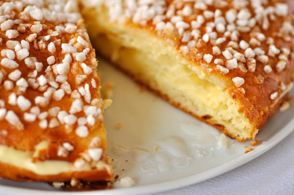 Laat de gist oplossen in een beetje lauwe melk (duurt ongeveer een kwartiertje, af en toe doorroeren). Roer de bloem, het zout en de suiker in een ruime kom door elkaar. Doe er de gist, de rest van de lauwe melk, de boter, het oranjebloesemwater en het ei bij en kneed alles tot een soepele deegbal. Leg een theedoek over de kom en laat 2 uur staan. Beboter een springvorm en verdeel het deeg gelijkmatig over de bodem. Laat nog 30 minuten narijzen.