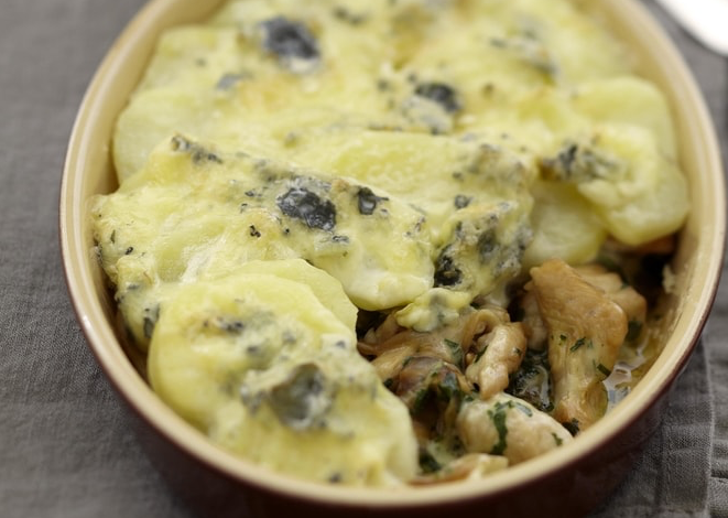 Dit weekeinde sluiten zo’n beetje alle skistations hier in de Alpes-du-Sud, maar dat betekent niet dat het er echt warmer op wordt. Jawel, we hebben een tijdje lekker weer gehad, maar deze week sloeg de kou ineens weer genadeloos toe en was het afgelopen met de buitenlunch. Nachtvorst, ijzige mistral, dat werk. En als verzuiderlijkte noorderling trok ik meteen m’n schippestrui, dikke duffel en dubbele wintersokken weer uit de kast. Evengoed loop ik te rillen, en heb ik meteen geen trek meer in zonnige zomerslaatjes en lichte hapjesniemendalletjes. Ferme kost moet het zijn, troosteten voor gevorderden. Maar ook weer geen stugge winterstoemp, ik ben al depri genoeg. Een tartifle dus. Klinkt fleurig, smaakt smeuïg en kan het sombere gemoed weer een ‘boost’ geven. Een ovenschotel met aardappel, kaas, en uien waarvan de Savoyars zeggen dat ze ‘m hebben uitgevonden, maar hier de Provence weten we wel beter; het waren de Romeinen, die hebben ook hier flink lang rondgehangen en aardig wat recepten rondgestrooid. In de Savoie noemen ze het een tartiflette (aardappel in het arpitan-dialect dat ze daar spraken), en stoppen ze er de plaatselijke reblochon in. Wij noemen ‘m tartifle (naar tartiflâ, uit het arpitan dat ze hier in de Provence spraken) en maken hem liever met Italiaanse gorgonzola. En niks geen spekjes: kipreepjes. Maar wie liever vegetarisch wil laat ze er gewoon helemaal uit. En champignons, en peterselie, en knoflook. En vanzelfsprekend komt er geen boter aan te pas, maar olijfolie. Als je daar niet warm van wordt …
