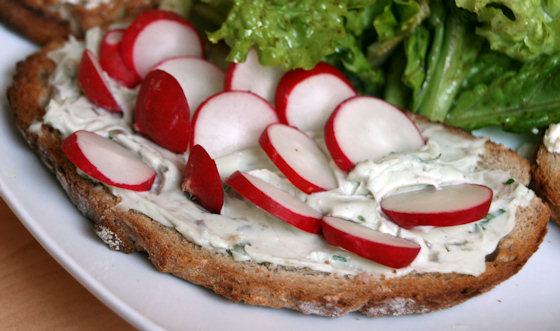 Pel het teentje knoflook, snipper de bieslook of de peterselie, was en snij de radijsjes in ragfijne plakjes. Leg de sneden brood even onder de grill, aan twee kanten, tot ze krokant zijn. Wrijf ze in met het knoflookteentje. Leg op elke snee een plak ham, verdeel daar de roomkaas over, bestrooi met bieslook of peterselie en verdeel de radijsschijfjes erover. Maal er een flinke draai peper uit de molen overheen.
