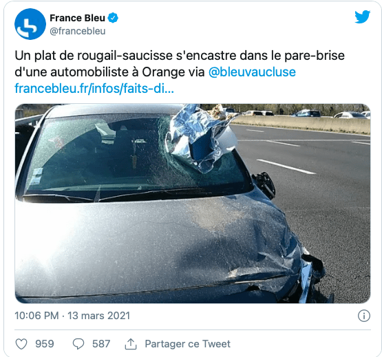‘Het moet niet gekker worden’, dacht ik toen ik vorige week in de krant las dat op de A7 bij Orange (Vaucluse) een mevrouw van de weg was geraakt doordat ze een ovenschaal met ‘rougail saucisses’ vol op de voorruit kreeg. Die ging in gruizels, zij kwam er met de schrik en een lichte polsblessure vanaf. Van het gerecht dat uit de open laadbak van een pickupje was gevlogen, bleef minder over.