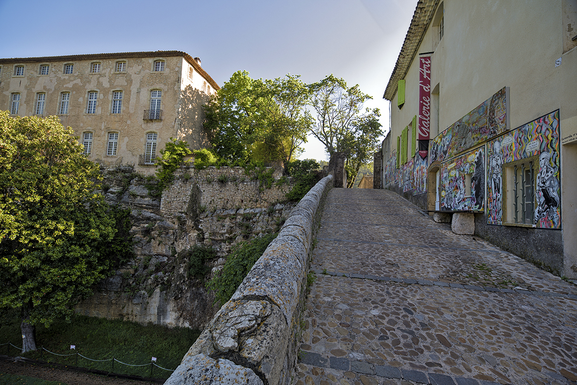 Naast dat château (privé-bezit) loopt een steil straatje en daar vind je de galerie van Patrice Chambrier, zelf ook kunstenaar. Hij dacht tijdens de ‘confinement’ toen er toch niemand langs kwam, laat ik eens lekker los gaan op m’n galeriemuren. De buitenmuren wel te verstaan. Street-art met een boodschap: de gezondheid van de planeet, de nieuwe wereld met robots en dieren, de volgende generatie, noem maar op. Ik heb geen oordeel over het kunstzinnige gehalte van wat hij gemaakt heeft. Ambachtelijk lijkt het me geen sinecure. Klik hier voor een time laps van zijn kunstwerk in wording.