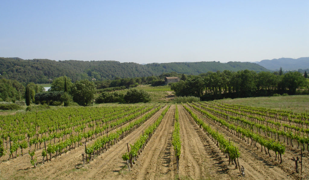 Op het laagste punt van de route, passeer je voor de eerste keer het riviertje de l’Aigue Brun. Een stroompje slechts. Water in het verder droge landschap. De weg loopt verder, stijgt ook iets en buigt om de beboste Collet du Pierrouret heen. Je loopt er door een typisch Provençaals landschap: dennenbomen, de volop bloeiende brem, een grote olijfgaard, abrikozen-, kersen- en amandelbomen. En, op de glooiingen van de beboste heuvel, wijnstokken!