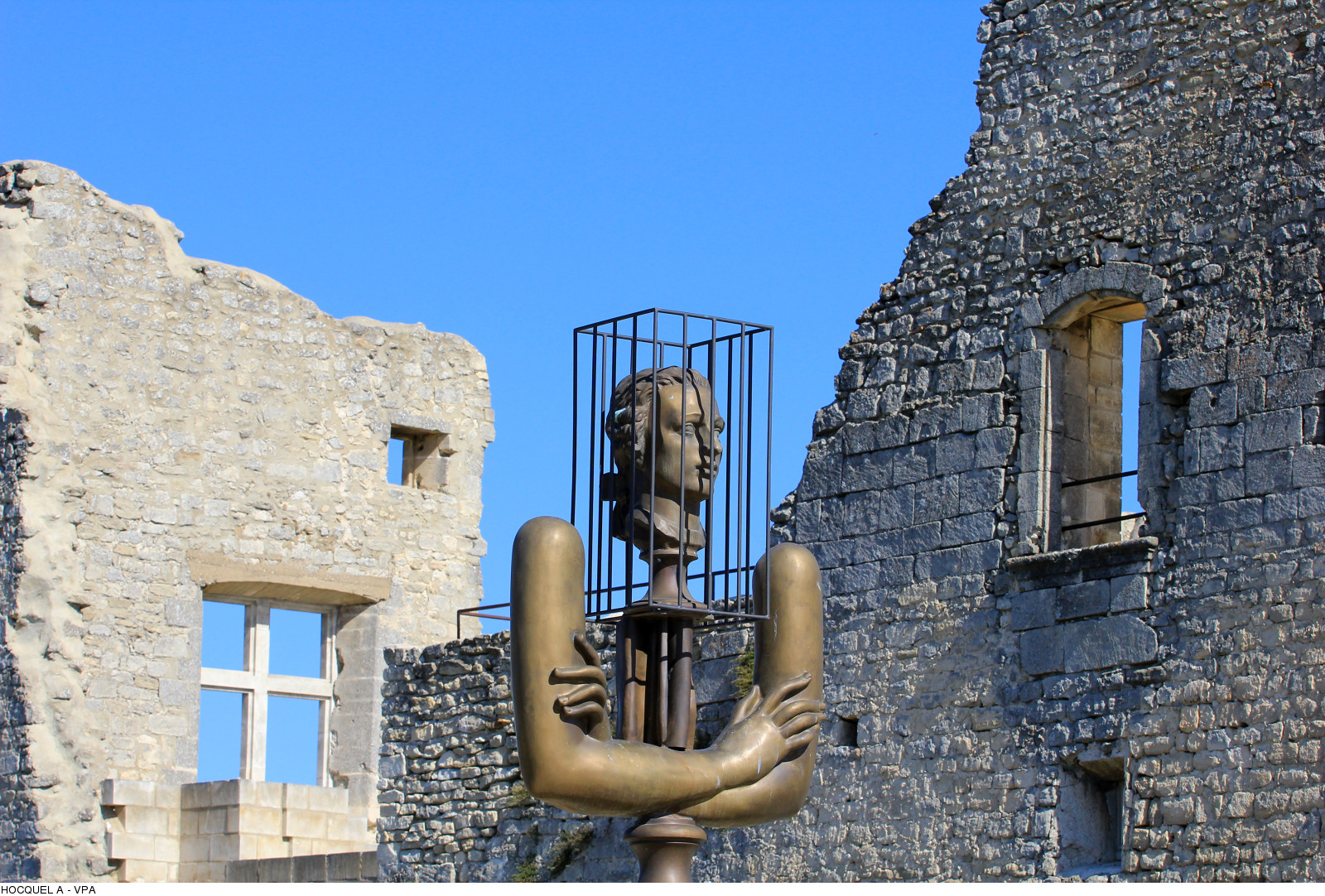 Naast de fraai geconserveerde ruïne van het De Sade-kasteel staat een imposant kunstwerk en een stukje verderop nog eentje (Cardin heeft in het dorp tal van kunstwerken neergezet); het ene laat twee ruimhartig uitgespreide armen zien, het andere een gekooid hoofd. Ik vind het nogal een tegenstelling, maar beide slaan blijkbaar op de roemruchte markies, die in dit door hem indertijd totaal herverbouwde voorvaderlijke kasteel met enige regelmaat zijn toevlucht zocht als hij weer eens door justitie (of zijn woedende schoonmoeder) gezocht werd wegens zijn scabreuze levensstijl. Hoewel netjes getrouwd, hield hij er flink wat maîtresjes op na met wie hij nogal bijzondere spelletjes speelde. De Sade is dan ook de naamgever van het begrip sadisme.