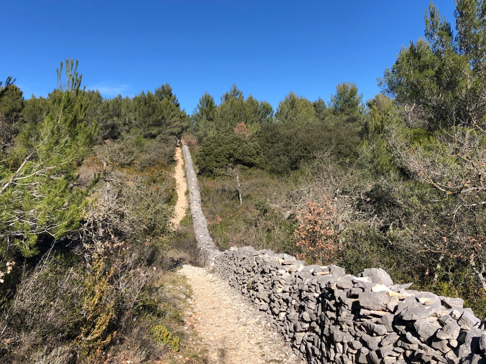 Je had tussen 1720 en 1723 een pest-epidemie die in de Provence naar schatting 120.000 mensen het leven kostte. Begon in Marseille, een schip uit de Levant, besmette bemanningsleden gingen de stad in en er was dus geen houden meer aan. Je had toen in de Luberon het Comtat Venaissin, het laatste stukje Frankrijk in handen van het Vaticaan. Daar werd gedacht dat een 25 km lange muur tussen de Mont Ventoux en de Durance de gruwelziekte wel buiten de deur zou houden. Niet dus, maar naar men zegt wel een heel klein beetje. Van die muur is niet veel meer over, maar ter hoogte van Cabrières d’Avignon staat nog een heel stuk overeind, met een wandelpad er langs. Ongerepte natuur, olijf- en amandelbomen, de route leidt je naar La Plantade, een groene oase, en uiteindelijk kom je weer terug in Cabrières waar je je auto op de parking voor de mairie hebt achtergelaten. Daar is je wandeling begonnen. Je bent niet moe, maar wel aan een hapje en een drankje toe.