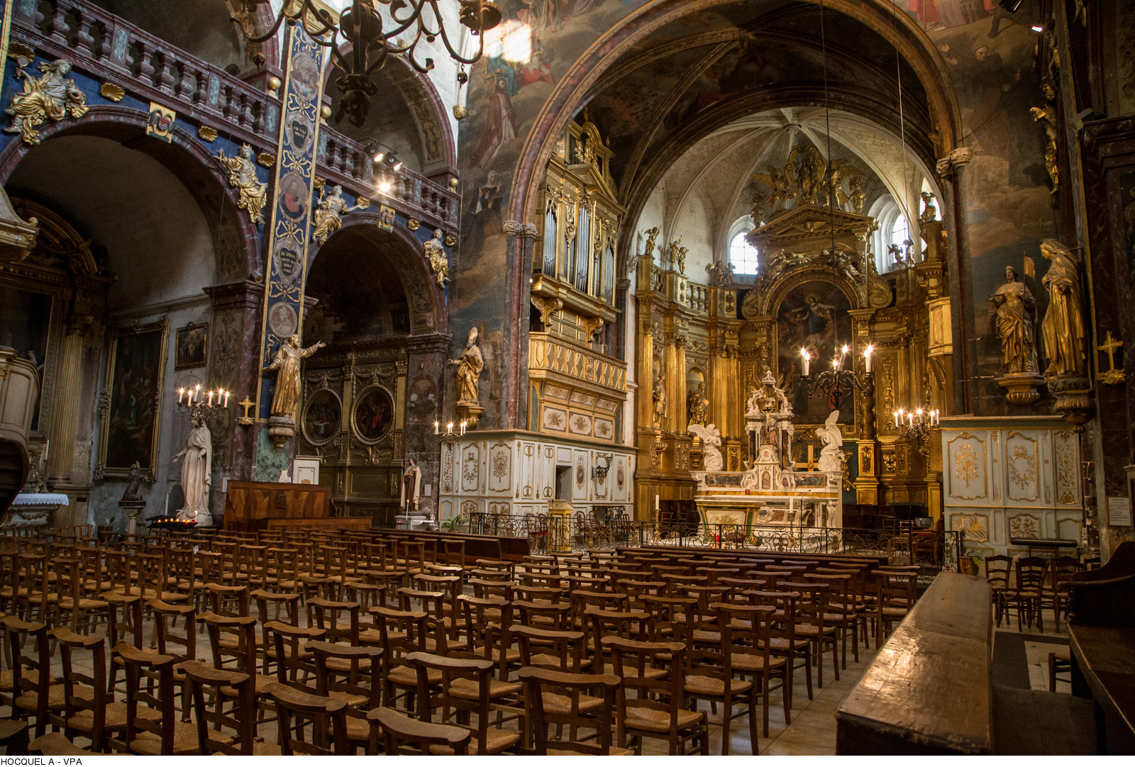 Het visserseiland in la Sorgue en zijn zijarmen veranderde in de loop der eeuwen in een belangrijke ‘cité’. Mede dankzij een joodse gemeenschap die er zich onder bescherming van de paus kon ontwikkelen. In de smalle, autovrije steegjes van het centrumpje heersen de middeleeuwen nog en je komt als het ware vanzelf bij de gotische kerk Notre-Dame-des-Anges terecht. Met zijn barokke interieur dat tot het mooiste van de Franse kerken wordt gerekend. Ik liep er even binnen en was diep onder de indruk.