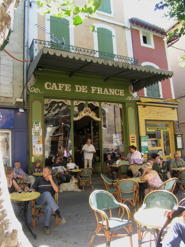 Die kade is een ‘quai gastronomique’, het aantal restaurantjes (met een Franse, Italiaanse dan wel een oosterse keuken) valt amper te tellen. Op zich niet zo verwonderlijk, want ze beschikken bijna allemaal over een aangenaam terras aan de hier en daar overbrugde rivier, la Sorgue. Op goed geluk koos ik er eentje uit en het werd een prima Italo-lunch met rivierkreeftjes aan het snelstromende en ongewoon heldere water waarin ik visjes ontwaarde. En het hele terras deelde de maaltijd met een paar brutale eenden, die op een soort traptrede in het water aanmeerden en ons het brood uit de mond snaterden. Bedelaarssucces viel hen niet te ontzeggen en ik besefte dat ook in een toeristisch epicentrum de sfeer bijna ongewoon weldadig kan zijn. In tegenstelling tot die ochtend tufte er tussen 12 en 15 uur vrijwel geen auto over de kade. Ik besloot tot een ‘saloperie’ (‘viezigheidje’ = borreltje) bij de espresso. Iets van tijdrekken leek me geen verkeerd plan en ik hoefde nog lang niet naar huis. Ik kreeg later, toen ik aan vrienden aan de Côte verslag uitbracht, dat ik beter in de kennelijk wereldberoemde brasserie Café de France had kunnen lunchen. Heb je vaker, tips die te laat komen.