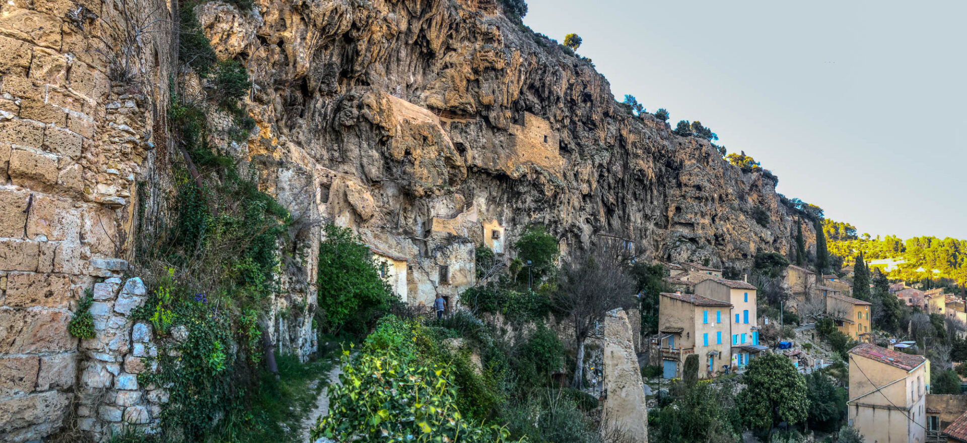 Een ander aspect van het dorp is dat je hoe dan ook bij voorbaat onder de indruk raakt van de wel heel oude rots, aan de voet waarvan het dorp ligt. Van welke kant je Cotignac ook benadert, die rots (en trots) met z’n grotwoningen. Je kunt er een kijkje nemen.