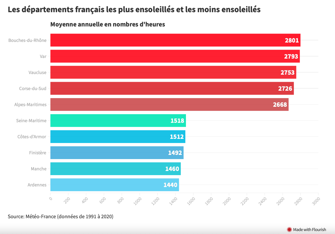 Verrassend genoeg eindigt niet het departement Alpes-Maritimes op kop, maar rolt de Bouches-du-Rhône als nummer 1 uit de bus met gemiddeld 2.801 jaarlijkse zonuren, gevolgd door Le Var (2.793). De Alpes-Maritimes komen slechts op de vijfde plaats en moeten ook de Vaucluse en Corsica voor laten gaan.