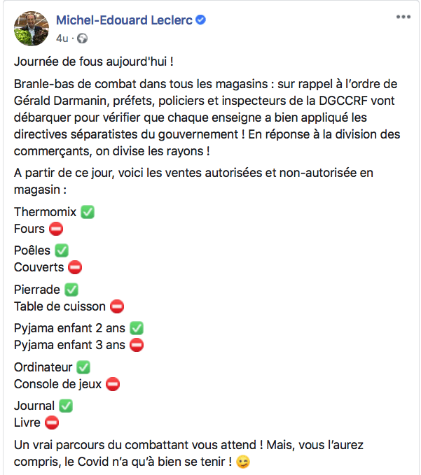 Winkels – kleine middenstanders – die ‘niet essentiële’ producten verkopen moesten dicht. Dat heeft inmiddels tot opstand geleid onder winkeliers, want de supermarkten die vergelijkbare producten verkopen, mochten wel gewoon openblijven. Oneerlijke concurrentie dus. Burgemeesters (niet de onze, het idee) maakten zich sterk voor hun middenstand en besloten het overheidsdecreet te negeren. Ze werden een voor een teruggefloten. ‘Bon’, besloot premier Castex als goedmakertje, ‘dan mogen de supermarchés die spullen ook niet meer verkopen.’ En dat leverde weer razende supermarktmensen op. Michel-Eduard LeClerc (inderdaad, van die keten) haalde woedend uit op internet en zette een aantal producten die wel en niet mochten worden verkocht op een rijtje om de willekeur aan te geven.