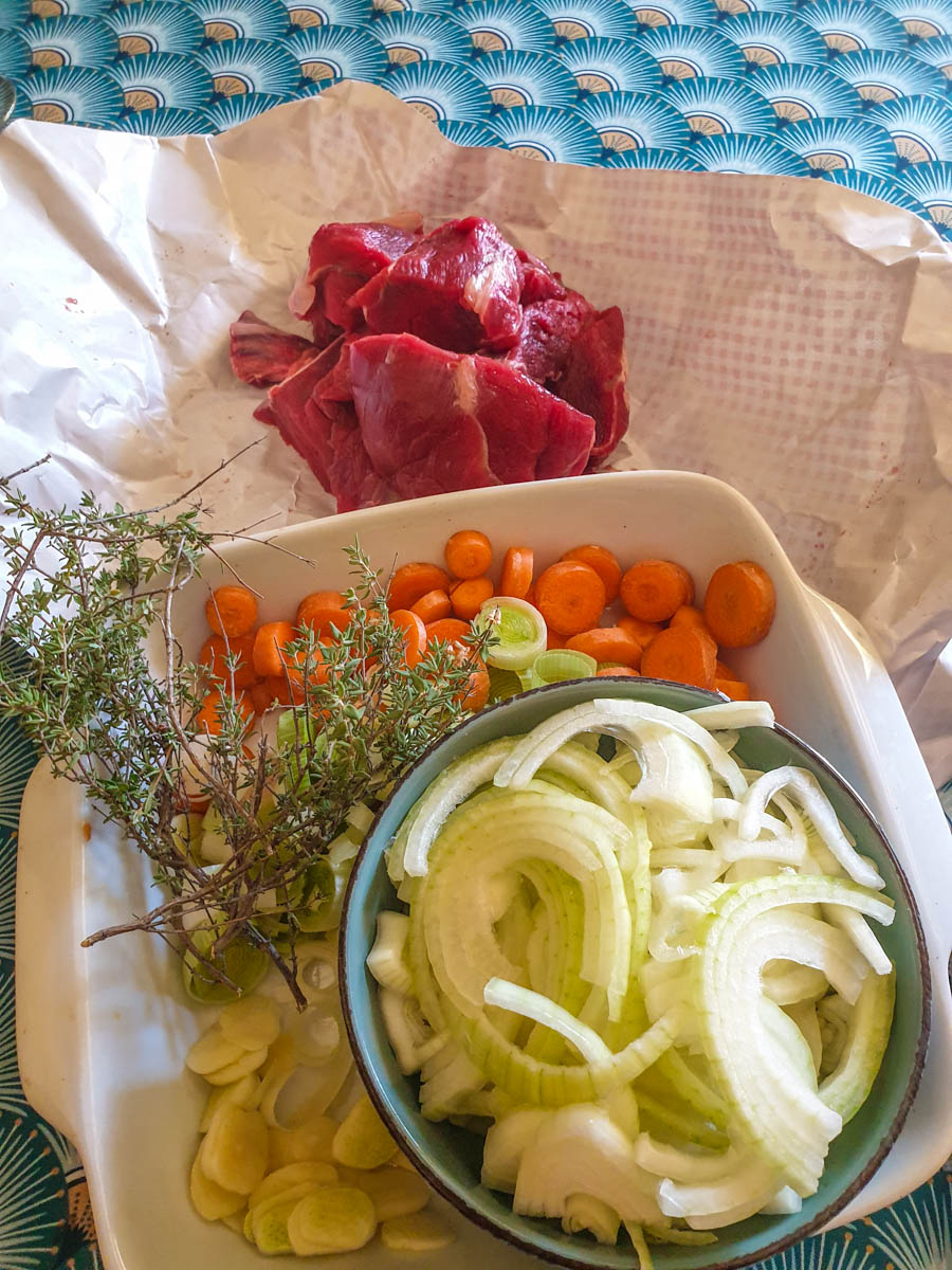 Het is niet alleen het landschap dat ontroert. Of is de natuur nu juist de voedingsbodem voor de melancholie? Is dit het Frankrijk dat het hart raakt? De aanwezigheid van wijnstokken? En in hun midden te mogen verblijven? Op de emaillen vakantietafel staat een daube, een stoofpot van rundvlees. Met wijn ‘van beneden’ erin. Het vlees ervoor gewoon gekocht bij de sympathieke slagersjongen van de Intermarché in Vaison-la-Romaine. Hij snapt wat ik wil maken, adviseert mij uitstekend (meer vlees dan ik nodig heb voor twee, maar ja, een tweede keer is de daube immers nog lekkerder). De rest is aan mij. Bij gebrek aan een stoofpan, grijp ik – voor de eerst in mijn leven – naar de snelkookpan. Een kleinood dat vrijwel elk Frans keukenkastje siert. Ik durfde het nooit en was meer van het langzame kookwerk, maar moet nu wel experimenteren met het grote metalen, sissende monster.