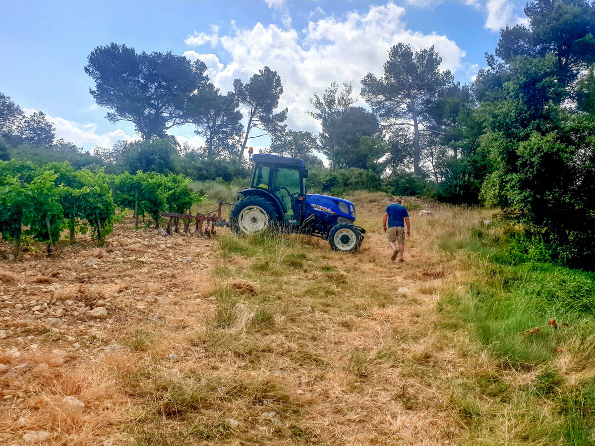 Ik zie hem als ik het vakantiewasje ophang in de achtertuin. Hij zwaait en zet de trekker uit om een wijnpraatje te maken. Ik vraag hem naar de verschillende wijngaarden. Welke druivenrassen hij heeft staan. Hij legt het allemaal geduldig uit: op de heuvel van Chantemerle zijn de percelen aangeplant met grenache, syrah, cinsault, marselan en vermentino. Dat is fijne informatie, dan hoef ik de cépages niet zelf meer te raden tijdens de ochtend- en avondommetjes door de wijngaarden.