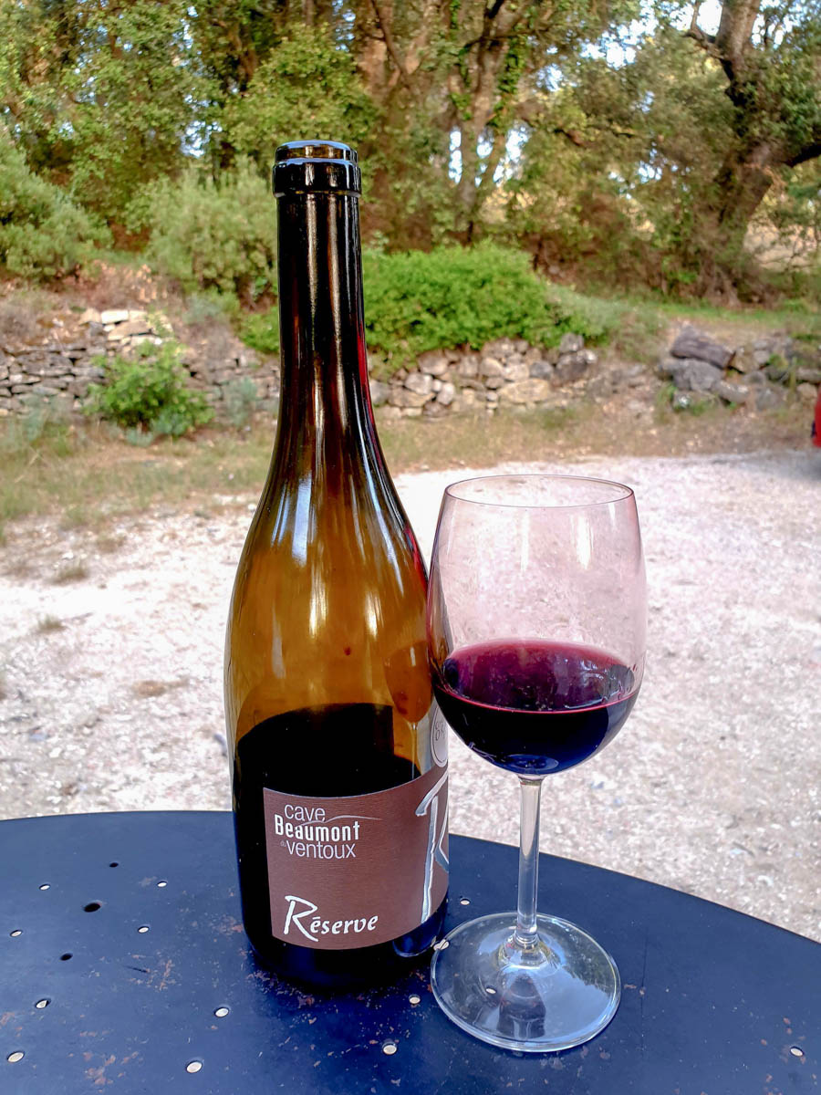 Mijn vakantiehuis is omringd door de wijngaarden van Frères Carme (de broers Nicolas en Sébastien) op de uitlopers van de reus Ventoux, in een van de drie productiebekkens van de AOC Ventoux, met een grote diversiteit aan terroirs: het gebied van Malaucène tussen de Ventoux en het massief van Dentelles de Montmirail. De Ventoux schurkt letterlijk in de rug van de gîte. Zo dicht tegen zijn kalkstenen lichaam aan, dat ik zijn karakteristieke kale kruin niet zie. De wijnstokken staan er op 500 meter hoogte, achter de hoogste wijngaard neemt het bos bezit van de Ventoux. De andere grens, het puntig-rotsige kantwerk van de Montmirail, doemt op aan de horizon. Beneden, aan de D938, in de bocht waar Ventoux-fietsers afslaan naar de D19 richting Bedoin om via de klassieke route de top van de Géant de Provence te bedwingen, ligt de Cave Beaumont du Ventoux.